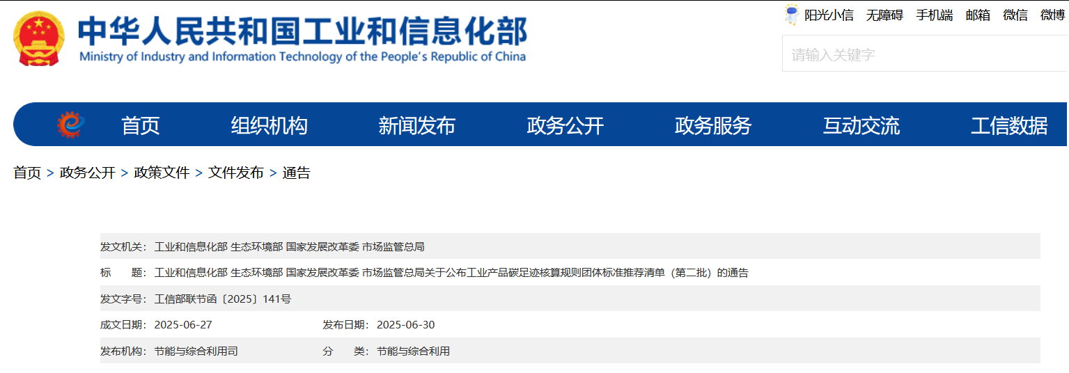 工業(yè)和信息化部等四部門關(guān)于公布工業(yè)產(chǎn)品碳足跡核算規(guī)則團(tuán)體標(biāo)準(zhǔn)推薦清單(第二批)的通告